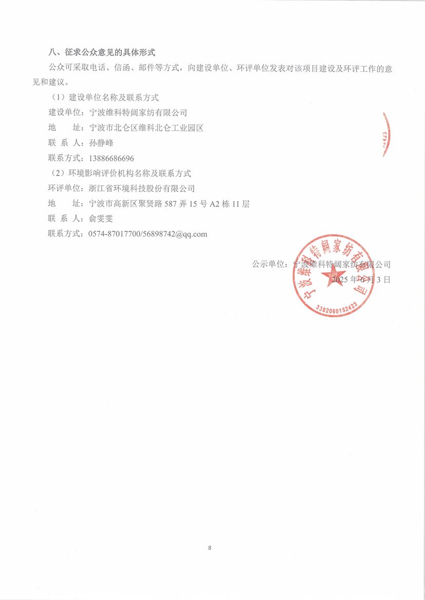 我公司的《寧波維科特闊家紡有限公司染色后整加工全棉特闊布6600萬米/年制造項目環(huán)境影響報告書》已完成編制,根據(jù)《浙江省建設(shè)項目環(huán)境保護管理辦法》(2021年修正)(省政府令第388號),現(xiàn)對項目主要內(nèi)容進行公示。
